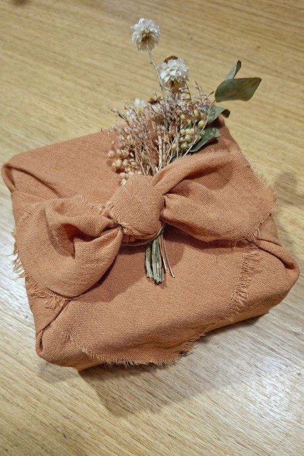 Caja de cartón grueso,forrada color kraft, envuelta en tela de gasa de algodón y ramito de flores secas