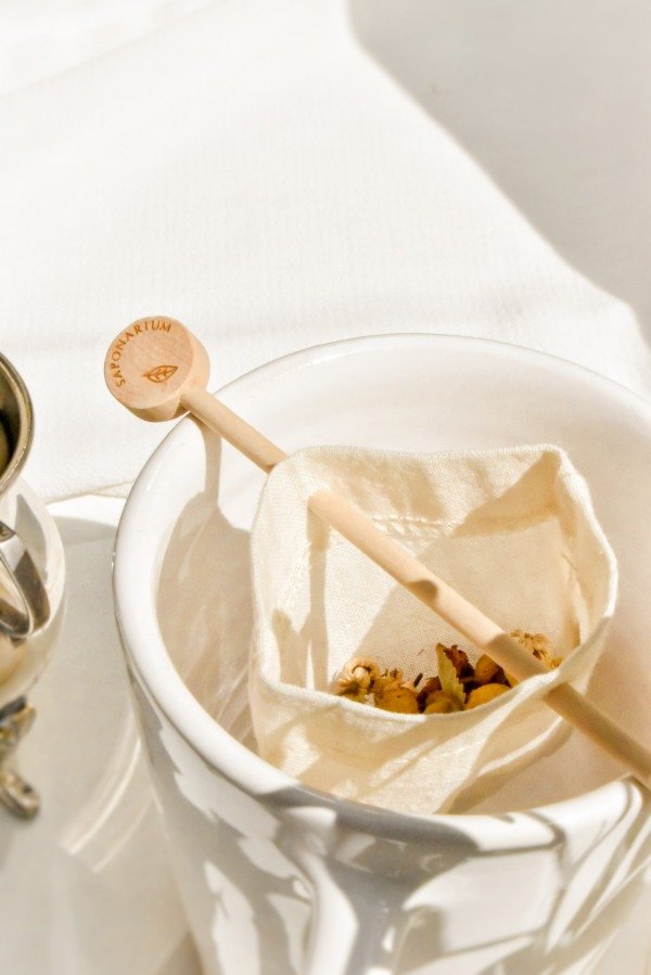 1 set de bolsitas para té en hebras o infusiones y 2 palitos de madera con soporte para taza o tetera. Todo en mini bolsa de tela, modelo japonés.