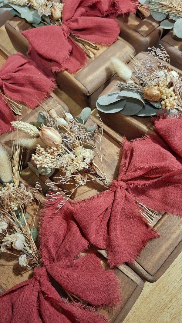 Caja de madera con tapa corrediza, con cinta de gasa y ramo de flores secas