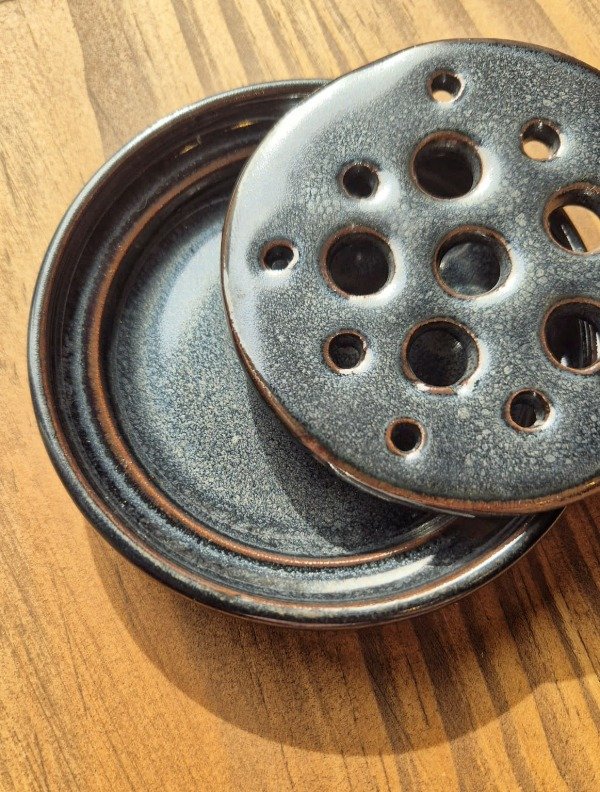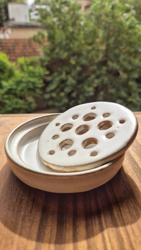 1 jabonera redonda de cerámica gres, con tapa ahuecada para mejor limpieza y drenaje