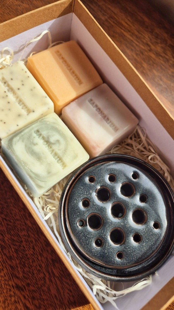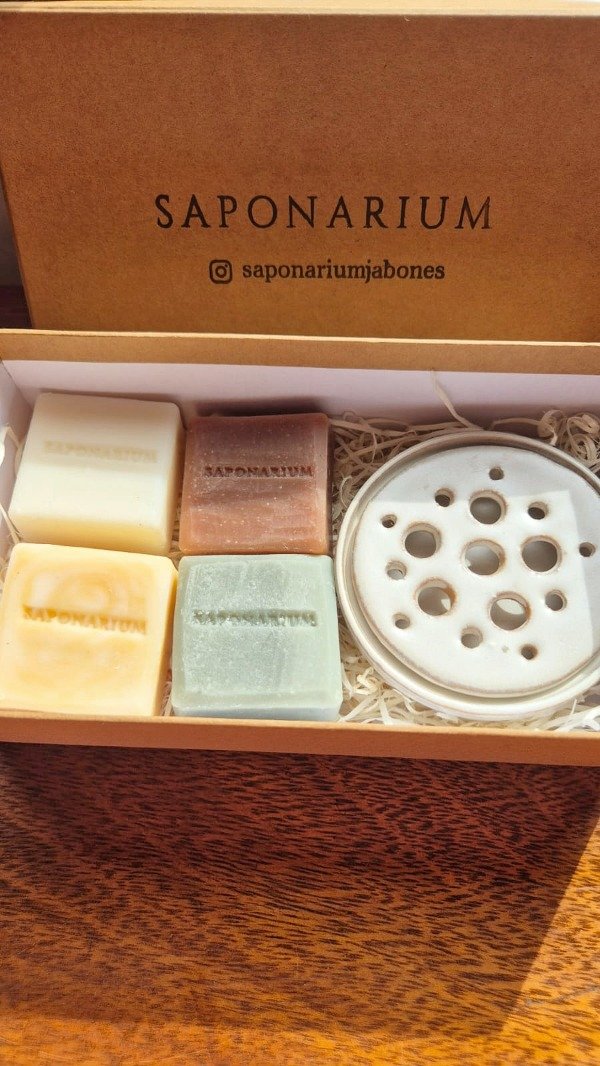 Las fotos son a modo ilustrativo. Los colores de las jaboneras y la variedad de los jabones de esta caja están sujetos a disponibilidad de stock